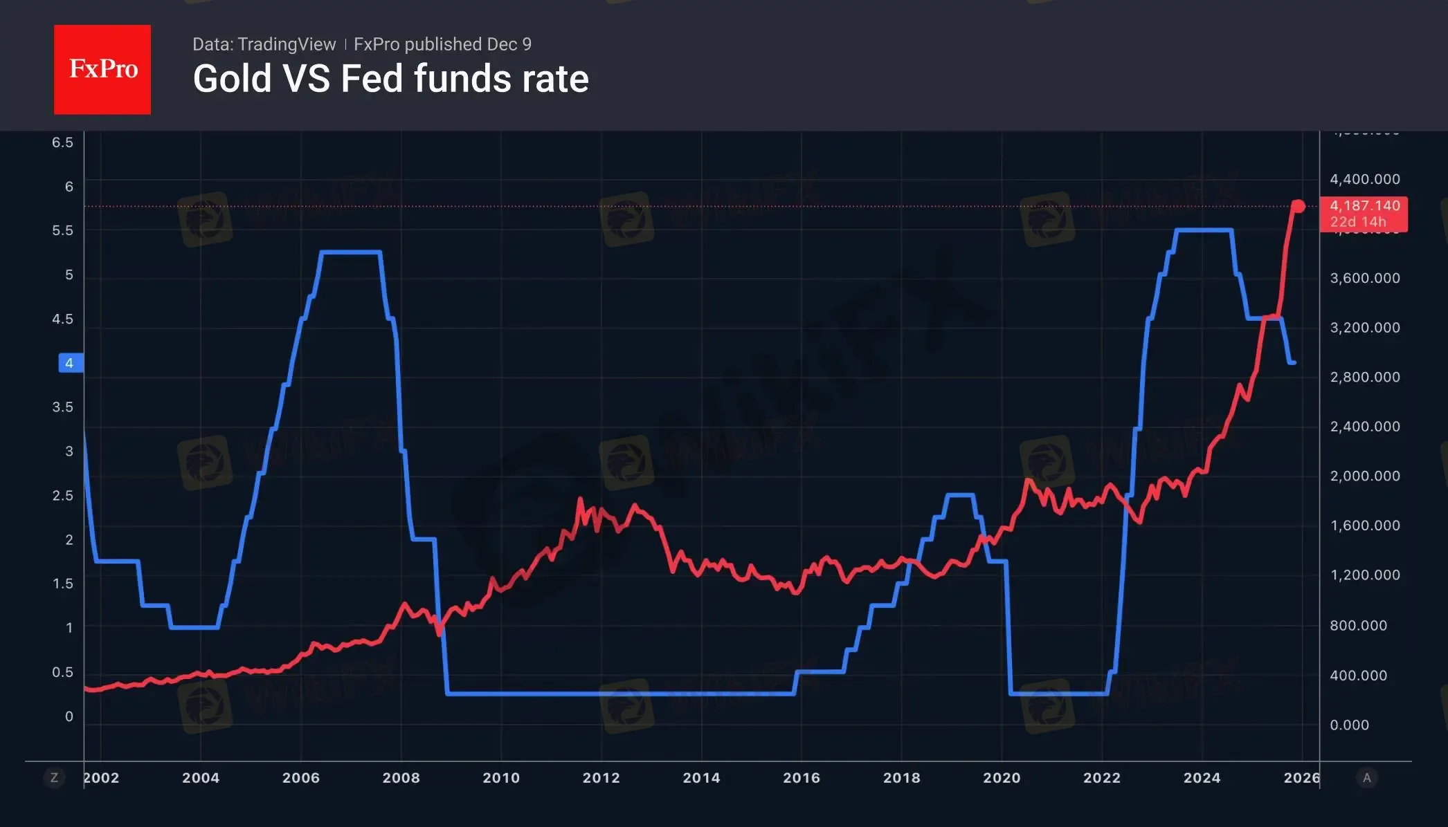 随着货币政策宽松周期的动能开始削弱,空头押注黄金价格将跌破 4000 美元。衍生品市场此前预计 2026 年将迎来三次降息,但一周之后,降息预期已经变为两次。国际清算银行(BIS)指出,美联储的宽松政策是推动 2025 年黄金价格上涨 60% 的首要因素。
