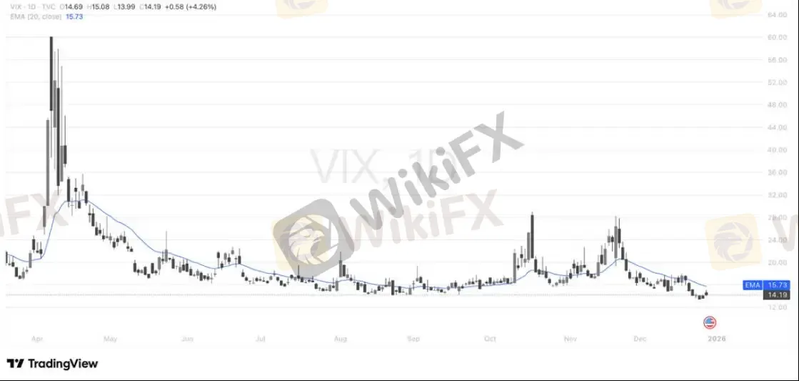 从日线结构看,VIX 持续运行在 EMA20 下方,整体维持低位震荡格局,显示市场风险情绪相对稳定,恐慌溢价持续被压缩。此前几次波动率抬升均未形成趋势性扩散,而是快速回落,说明当前更多是事件驱动下的短期扰动,而非系统性风险重估。在 VIX 未重新站上 EMA20 并出现连续放量走高之前,整体环境仍偏向利好风险资产,但低位横盘也意味着一旦出现突发催化,波动率具备阶段性反弹的敏感性。