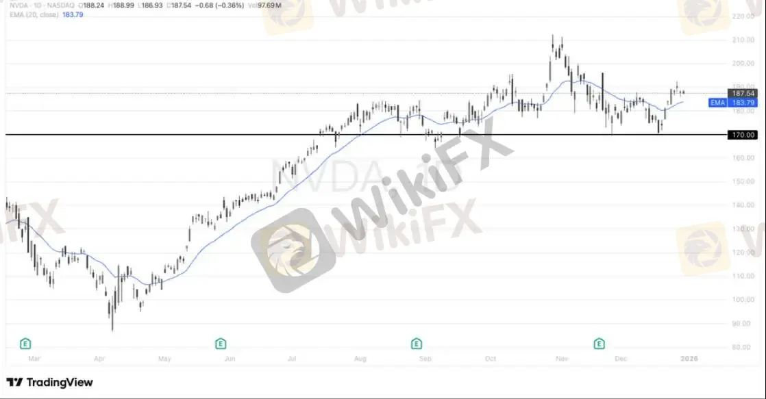 从日线结构看,英伟达 在前期强势上行后进入高位震荡修复,股价多次回踩 170 美元关键支撑 并获得确认,显示中期多头结构仍然稳固。当前价格重新站回 EMA20(约 184 美元) 上方,均线趋于走平,反映抛压释放后市场情绪逐步修复,但上方 190–195 美元区间 仍存在明显压力。在 CES 大会临近的背景下,走势更偏向“事件前整理”,短期或以区间震荡消化分歧,真正方向选择仍取决于大会期间对 AI、数据中心与物理 AI 叙事的增量信息是否足以推动资金重新定价。
