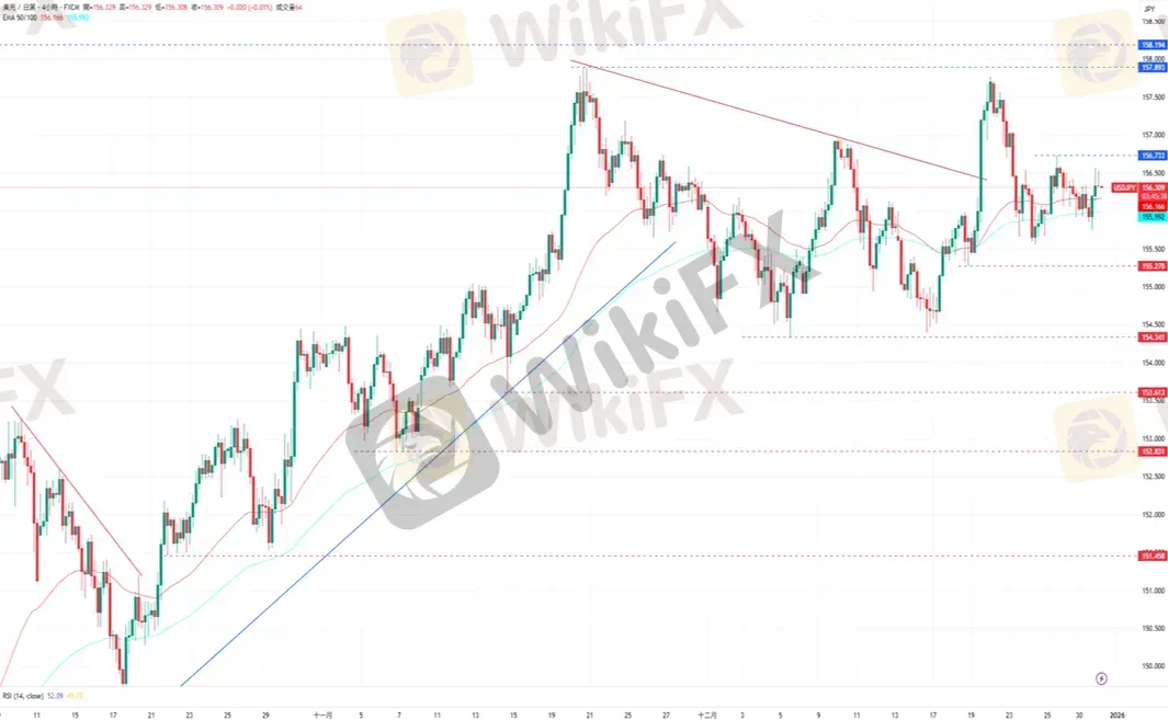 摘要:美元/日币(USDJPY):新闻事件:周二,由于适逢节假日,市场交易活动持续清淡,美元/日元上涨至156.329。日本方面,日本央行周一公布12月会议意见摘要,部分成员表示,日本实际利率仍处极低水平,暗示未来可能进一步升息。美国方面,美联储周二公布12月会议纪录,多数官员认为,只要通膨持续放缓,后续进一步降息属适当政策,但在降息时点与幅度上意见仍存在明显分歧。会议纪录显示,一些官员认为「在此次会议