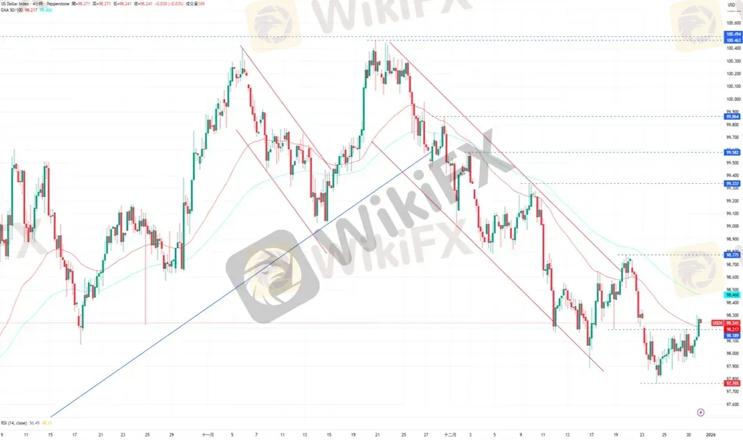 CPT Markets分析师指出,美元指数继续97.765开始的上涨修正,价格突破了EMA50均线,并尝试站稳于其上方。上涨方面,若能维持于EMA50上方,美元指数目前的阻力为12月19日的高点98.775,再来是12月9日的高点99.337。下跌方面,美元指数接下来的支撑为12月24日的低点97.765,接着是10月3日的低点97.614。