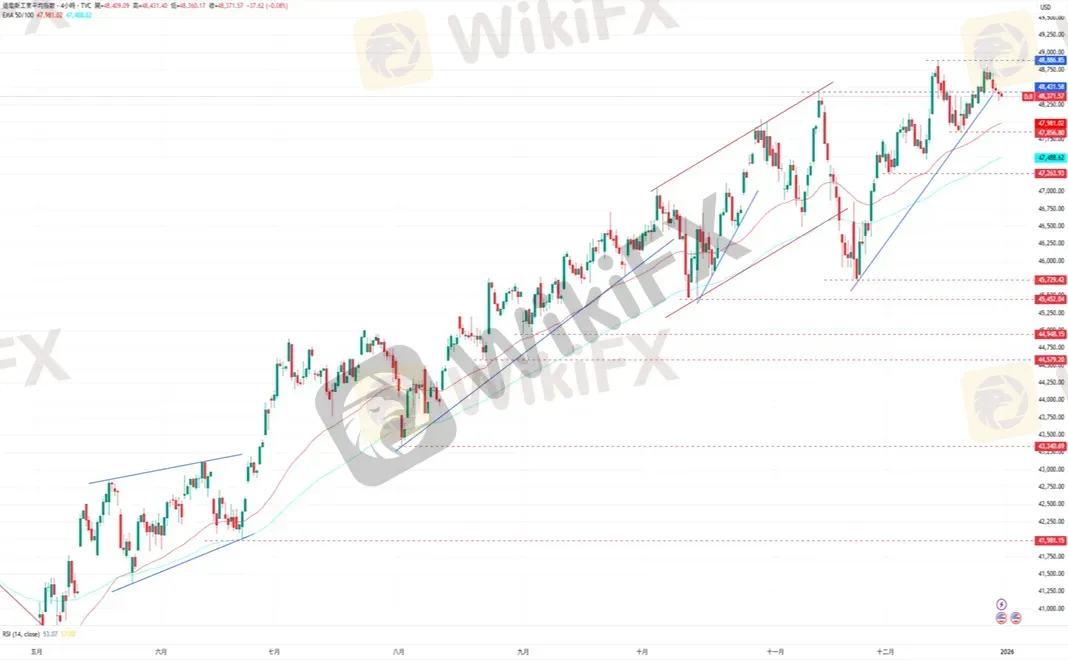 道琼指数继续自48781点回落,日内走势保持中性,受EMA50均线以及上涨趋势线的支撑,大方向仍偏向看涨。上涨方面,道琼指数目前的阻力为12月12日的高点48886点,再来是49000点水平。下跌方面,道琼指数目前的支撑为12月18日的低点47849点,接着为12月10日的低点47462点。