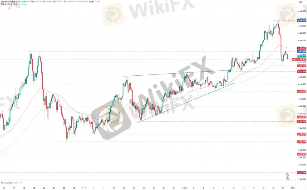 黄金价格自4300美元水平反弹,以消化RSI指针的超卖讯号,短期价格受EMA50均线的阻力而保持在其下方交易。下跌方面,黄金目前的支撑为12月29日的低点4301美元,再来是12月12日的低点4256美元。上涨方面,黄金目前的阻力是12月30日的高点4404美元,再来是12月29日的阻力4550美元。