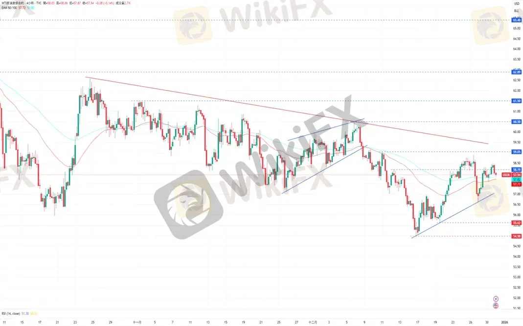 CPT Markets分析师指出,WTI原油保持在EMA50均线上方盘整,目前价格沿着自54.98美元开始的看涨修正趋势线移动。上涨方面,WTI原油目前的阻力为12月30日的高点58.47美元,再来12月5日的高点60.50美元。下跌方面,WTI原油目前的支撑为12月27日的低点56.65美元,再来是12月23日的低点55.62美元。