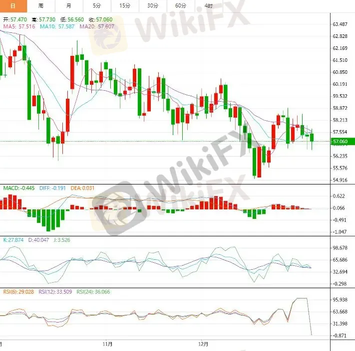 从日线级别观察,美原油整体仍运行在中期下降通道内,价格重心持续下移。油价在跌破 60 美元 / 桶关键心理关口后反弹乏力,目前持续运行于中长期均线系统下方,短期均线向下发散形成压制。动能指标方面,RSI 维持在 40 附近震荡,尚未进入超卖区间,显示下跌仍以趋势性回落为主;MACD 快慢线位于零轴下方运行,空头动能虽有边际减弱但尚未出现明确反转信号。综合技术形态,当前市场仍以弱势震荡偏空格局为主导。