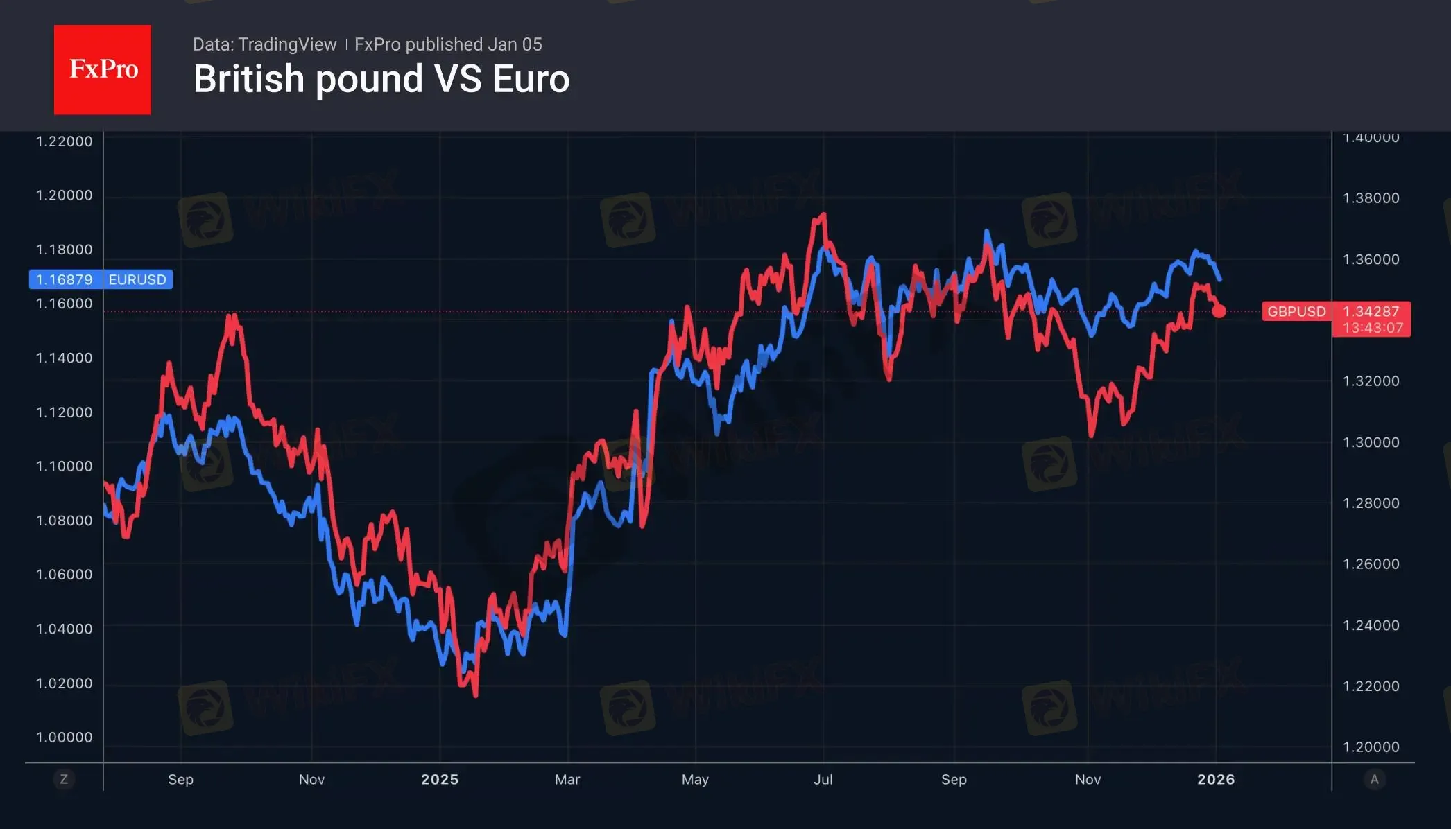 期货市场预计,1月联邦公开市场委员会(FOMC)会议降息的概率为17%,3月会议的降息概率则升至48%。美联储计划至少在春季前不采取任何措施,这一立场为美元走强提供了支撑。当前,受美国国债与欧亚债券收益率利差扩大影响,美元兑主要世界货币汇率持续攀升。