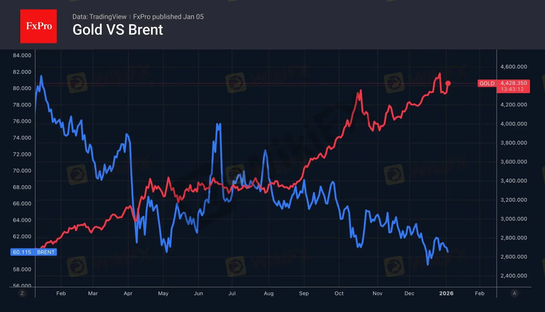 政治与地缘政治风险加剧,推动投资者涌向避险资产。黄金成为首选产品,在2025年大放异彩。受美国特种部队在委内瑞拉采取的重大行动提振,这一贵金属从局部低点强势反弹,投资者趁XAUUSD(黄金/美元)汇率下探之际成功抄底。然而,市场可能很快意识到,拉美局势对全球经济及原油市场的实际影响有限——委内瑞拉原油产量已从20世纪70年代的350万桶/日锐减至当前的100万桶/日,目前仅位列全球第18大产油国。