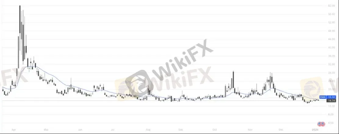从日线看,波动率指数整体维持下降通道运行,价格长期压制在 EMA 下方,反弹高点不断下移,显示市场恐慌情绪持续被消化。当前处于14–15 低位区间,属于偏风险偏好阶段,尚未出现系统性避险信号。在该结构未被放量上破前,波动率对风险资产的扰动有限,更偏向为震荡市或温和多头环境提供配合。