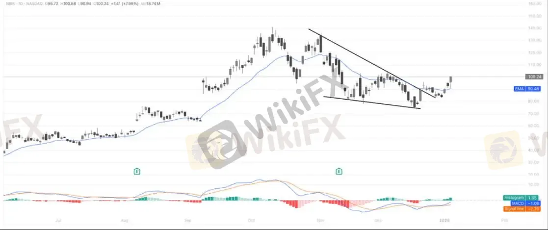 从技术分析来看,NBIS回调回补去年9月缺口后,反弹触及100美元整数关口,一次性突破概率偏低,回调至90-95美元支撑区间附近或具备更好进场机会。