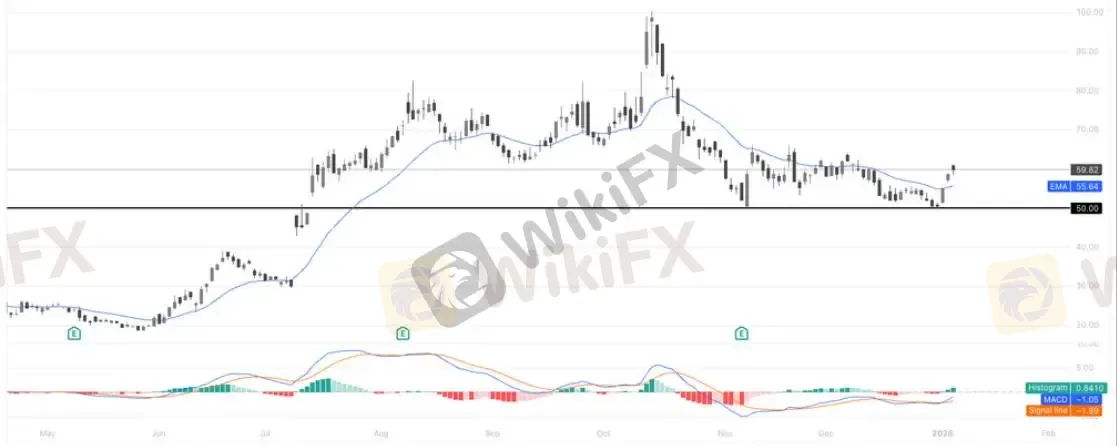 从日线图看,MP 目前正处于V型反弹后的横盘蓄势阶段。股价在 2026 年初放量突破了 50 美元的心理关口(该点位此前是强阻力位,现已转化为关键支撑)。目前上方第一个重大阻力区位于 $61.00 - $63.00,这是 2025 年末震荡波段的高点汇集区,若能有效突破并放量,将开启向 $70 整数关口发起的进攻。