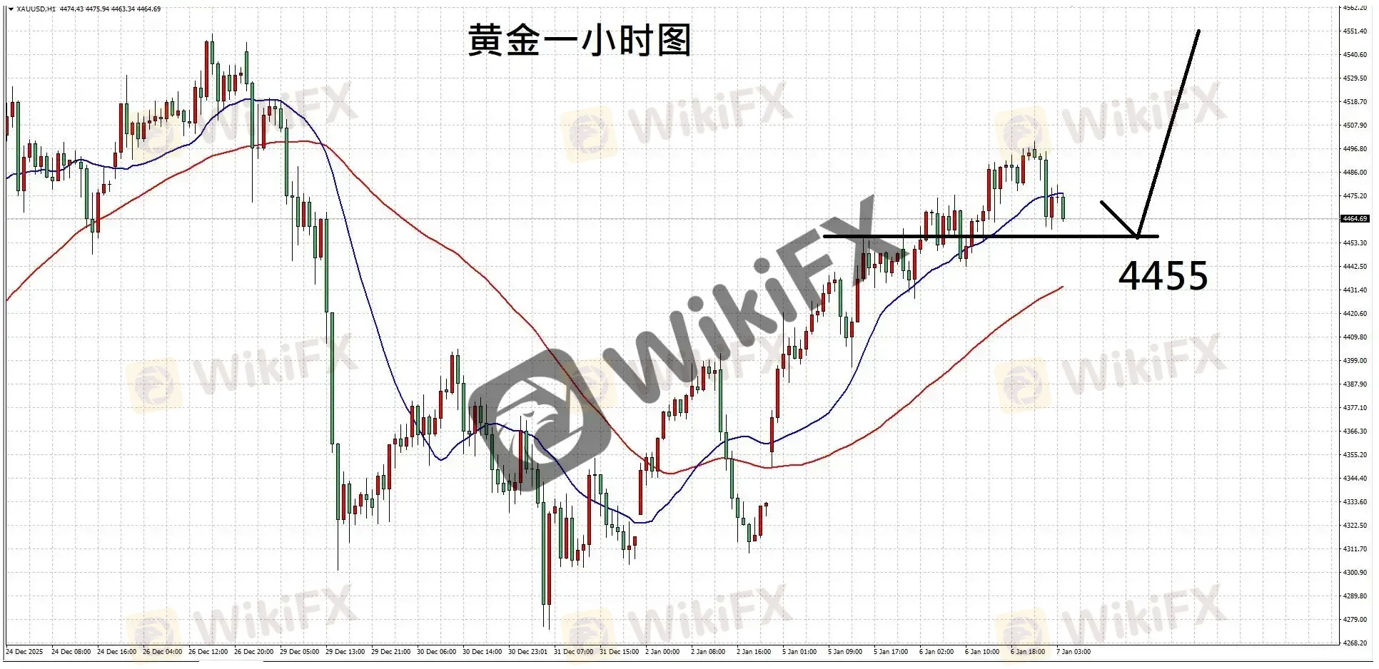 黄金一小时图,走势震荡后向上突破,并刷新短线高点,显示买盘增强;如后续回落未击破前期支撑,则走势重新走高,故建议短多操作。