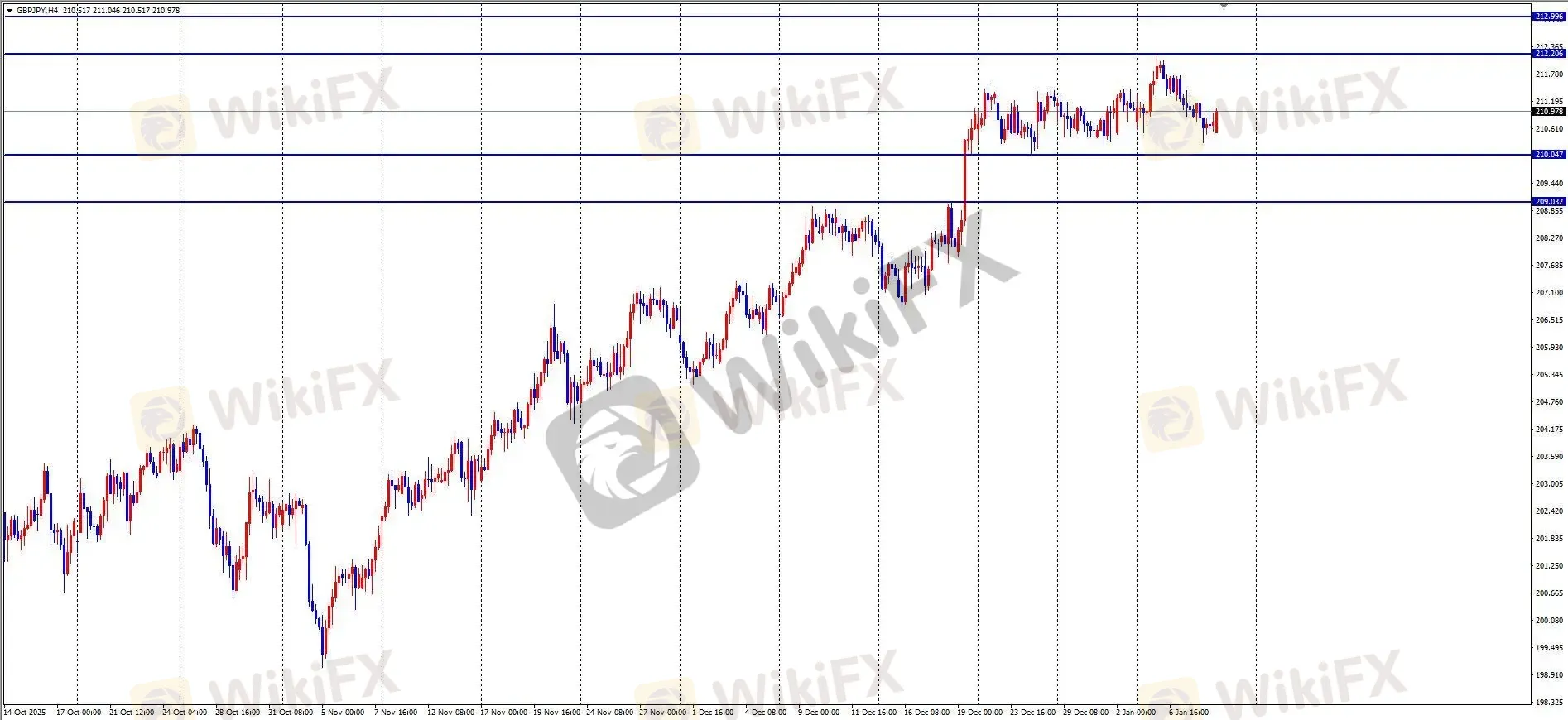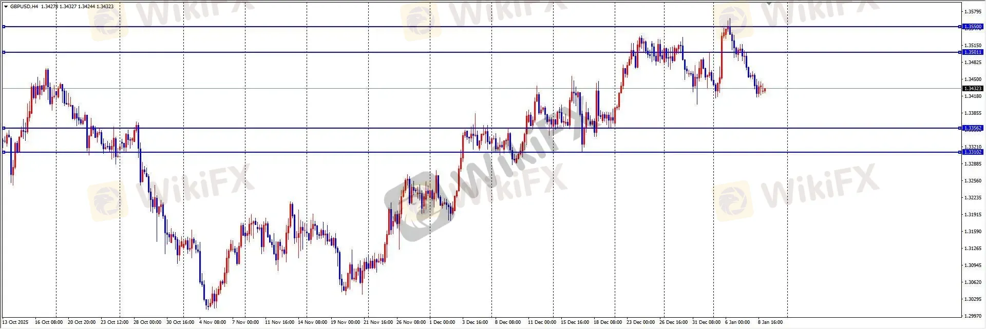 周四英国数据显示,12 月 Halifax 房价月率下跌 0.6% ,为 2023 年 8 月以来最大降幅,反映预算加税政策对房地产市场信心形成压制。美国劳动力市场与经济数据整体稳健。镑美延续震荡下行,最低触及 1.3415 附近,日线收上影阴线。ETO Markets 认为,汇价走势偏弱,短期仍有下行压力。