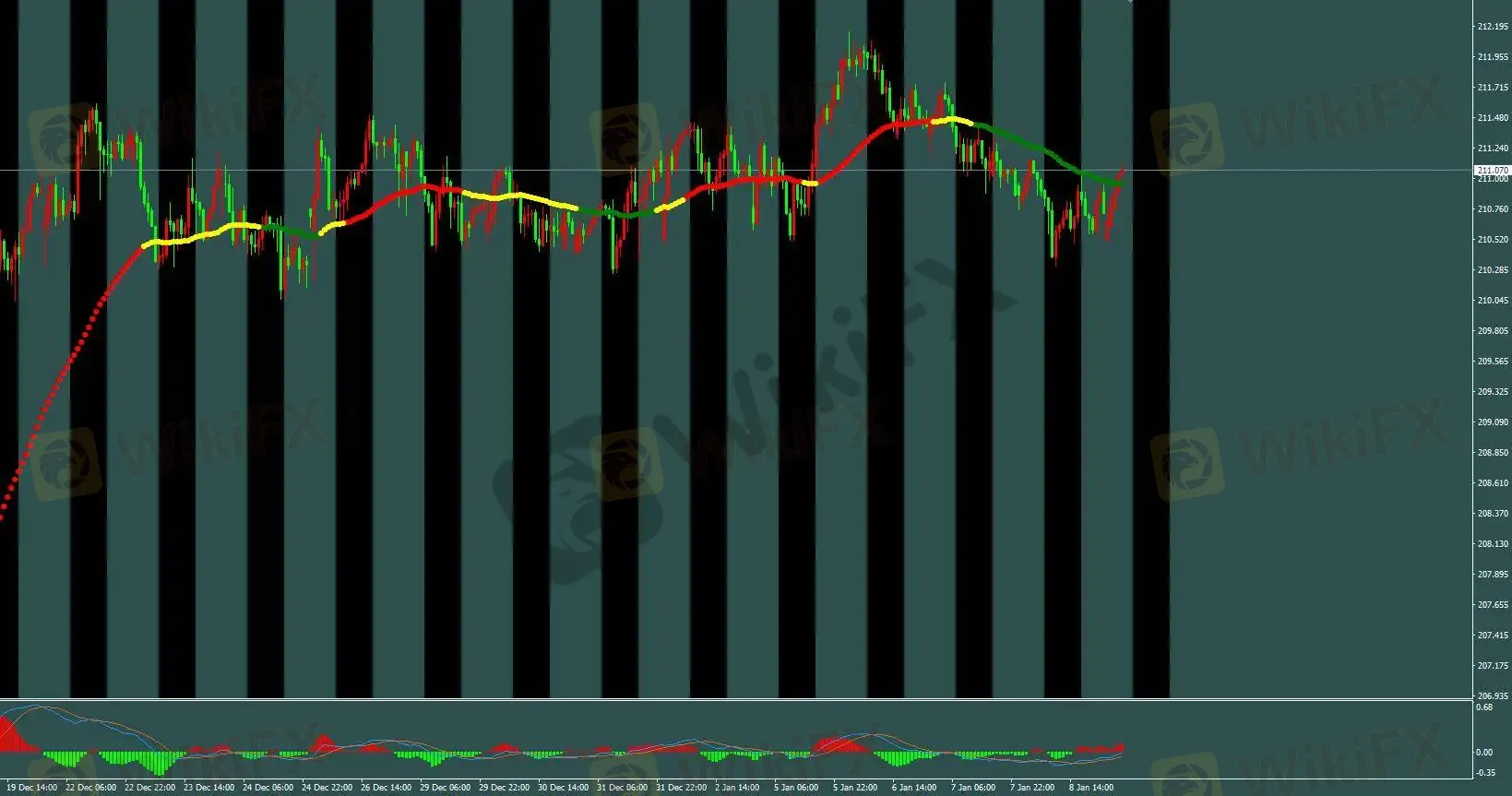 H1 三色线维持绿色,此前 211.40 附近的 H1 标准空单已盈利 70 点离场。日内建议继续参考 M5 基础模型进行短线操作。