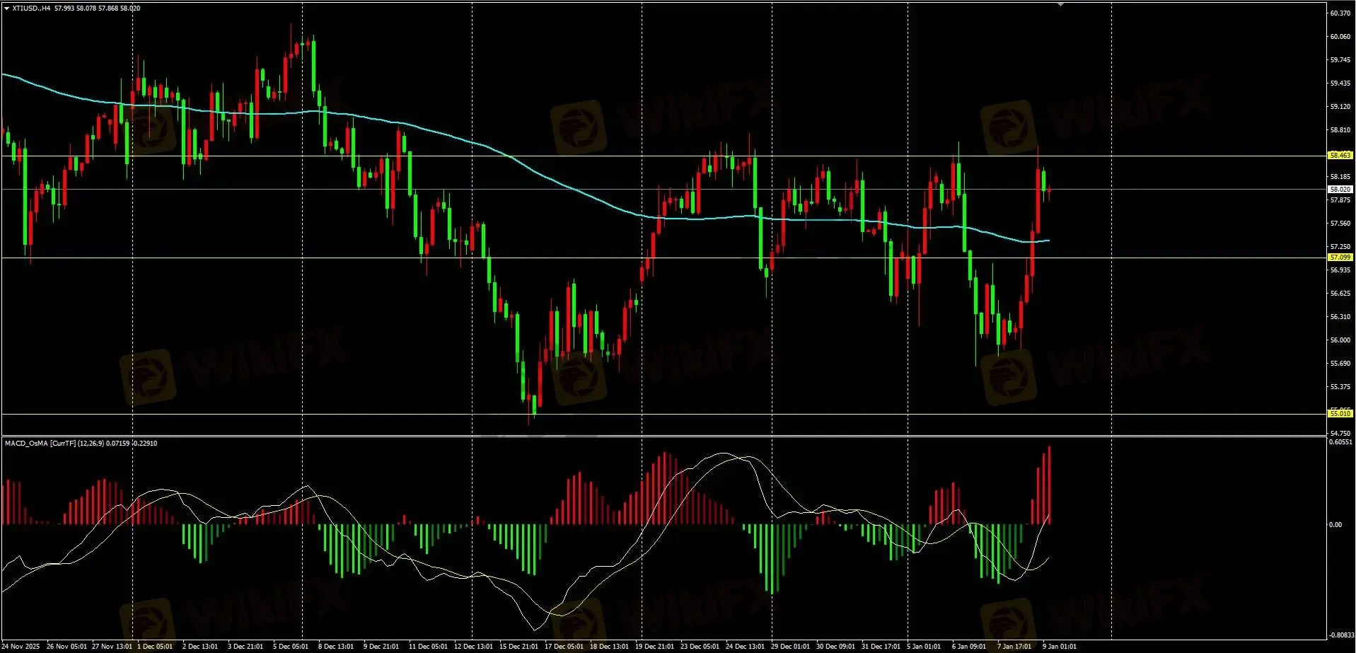 日内策略:昨日大幅度拉升,日线收阳,H4级别确认金叉。今日早盘小幅调整,小周期上涨动能减弱,日内优先考虑小周期回调,上方压力关注58.6,有效上破可继续尝试做多。下方支撑关注57.1结合M30H1级别144均线,下破再考虑做空。