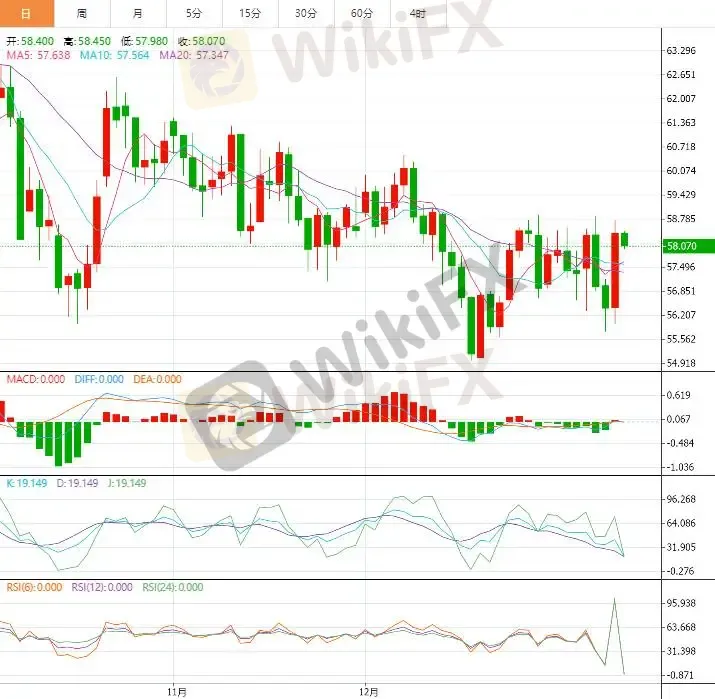 从日线走势来看,WTI 原油在连续回调后于 57 美元附近获得有效支撑,价格重新站回此前震荡区间下沿之上,显示下方买盘开始介入。K 线形态上,周四收出一根实体较大的阳线,基本覆盖前一交易日跌幅,形成反弹修复结构,表明短线空头动能明显减弱。技术指标方面,日线 RSI 自接近超卖区域回升至中性区间下方,动能由弱转稳;MACD 绿柱持续缩短,快慢线存在低位金叉的潜在迹象。整体而言,只要油价守住 56.5 – 57 美元关键支撑区间,短线仍具备向上测试 60 美元整数关口的技术条件,但 61 – 62 美元区域仍将构成阶段性压力带。