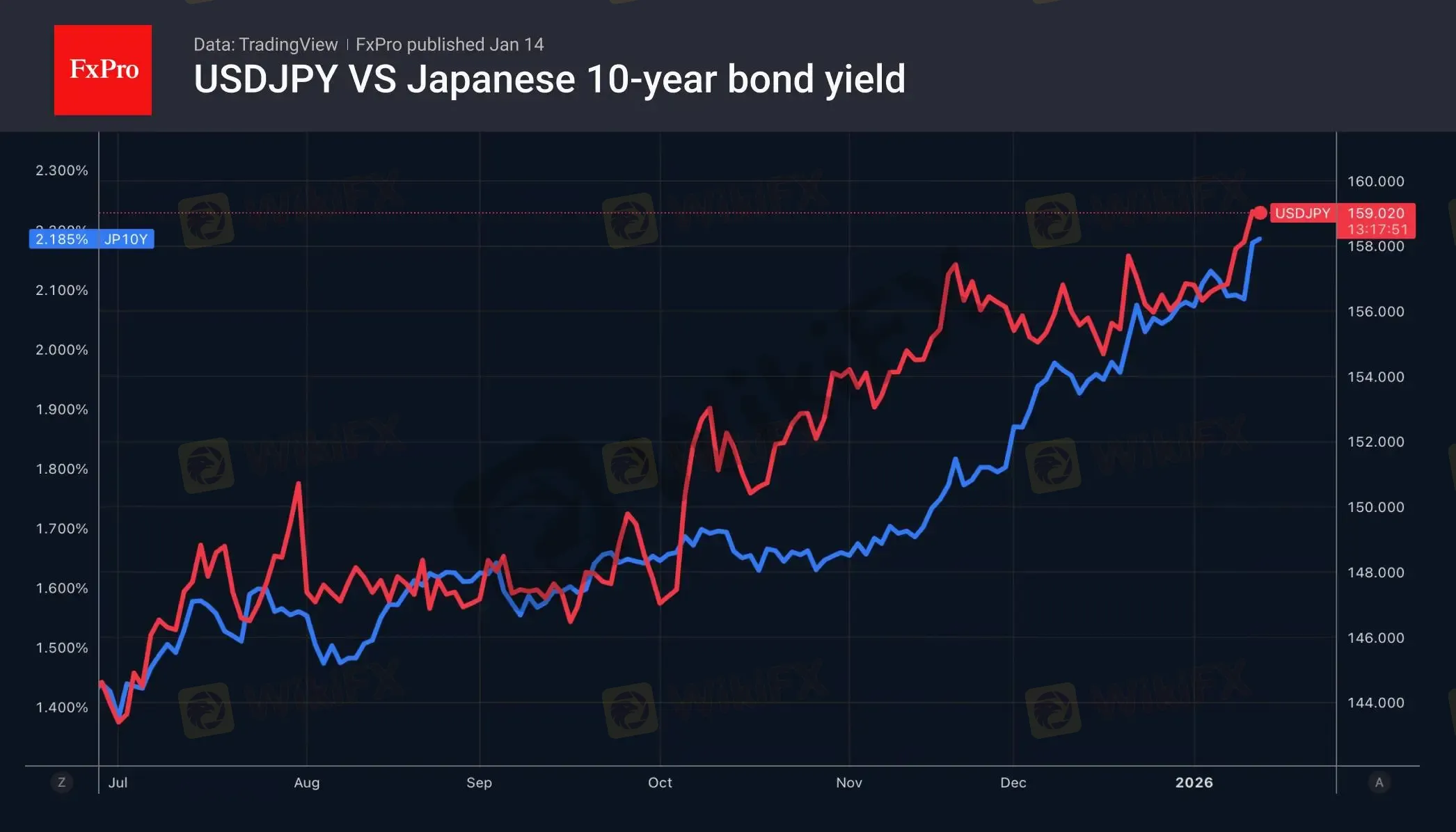 与此同时,日元持续遭受重创。投资者预期高市早苗Sanae Takaichi或将解散议会,并最早于 2 月启动新一轮大选。这一预期推动日本国债收益率走高,美元兑日元(USD/JPY)汇率飙升至 18 个月以来的高点,重新回到此前货币当局出手干预汇率的区间。