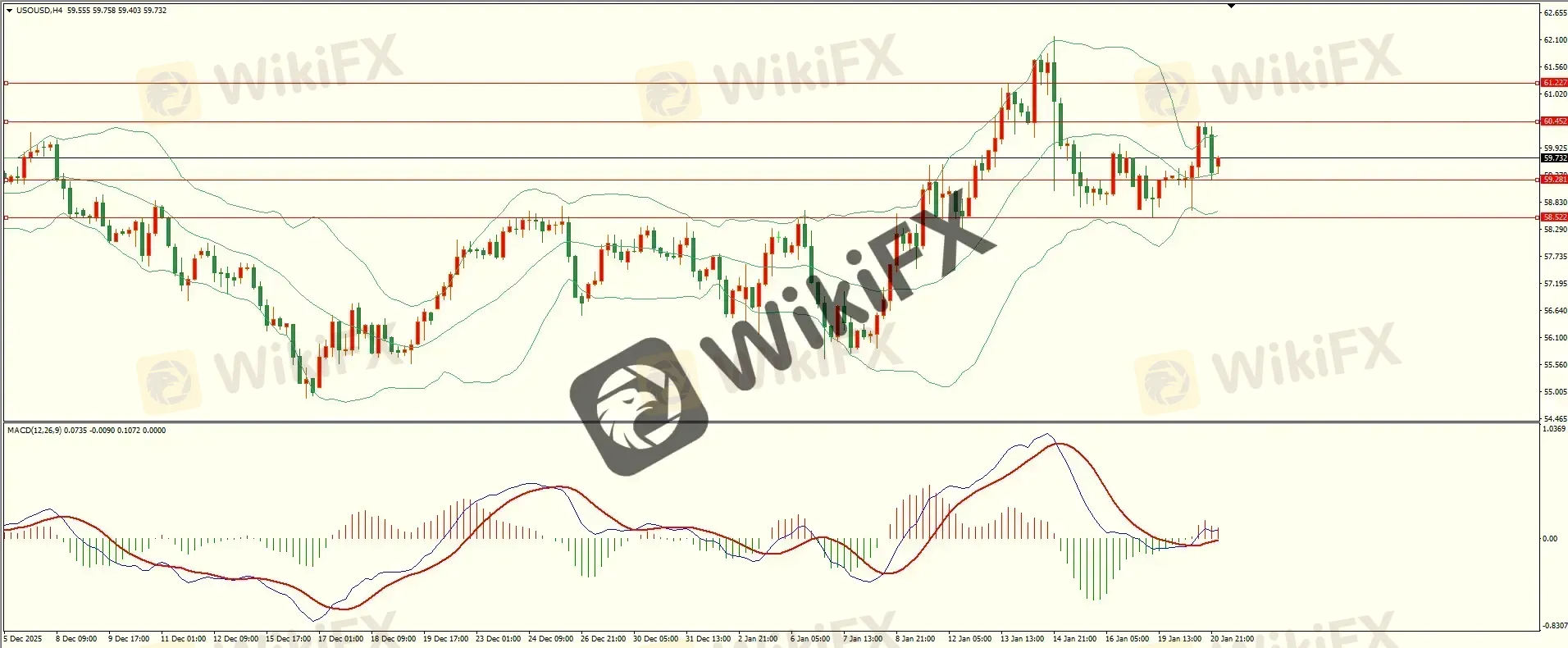 原油昨日回调至第一支撑展开反弹,盘中触及第一阻力上方冲高回落,日线报收小阳线,支撑与阻力并存,短线的多空震荡尚未结束,从4H来看,布林中轨偏上,MACD零轴附近运行,日内下方首要支撑59.25,第二支撑58.50,上方阻力60.45,61.20-30,保持在第一支撑上方短线有望回测第一阻力。
