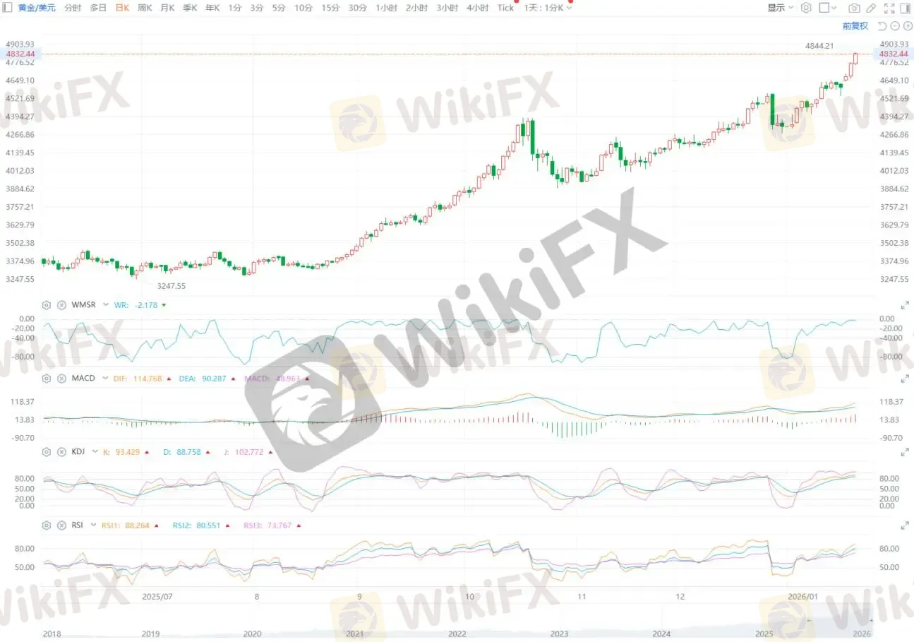 摘要:一、行情回顾速览 据 ETO Markets 市场监测显示,1 月 20 日(周二)现货黄金强势突破 4700 美元/盎司关口,盘中快速拉升并刷新历史新高,白银同步上行,美元、美股及美债集体承压,市场风险偏好明显回落。现货黄金当日一度站上 4700 美元/盎司上方,收盘维持高位运行。1 月 21 日(周三)亚市早盘,现货黄金延续强势上行走势,再度刷新历史纪录高点,盘中最高触及 4844.21 美元