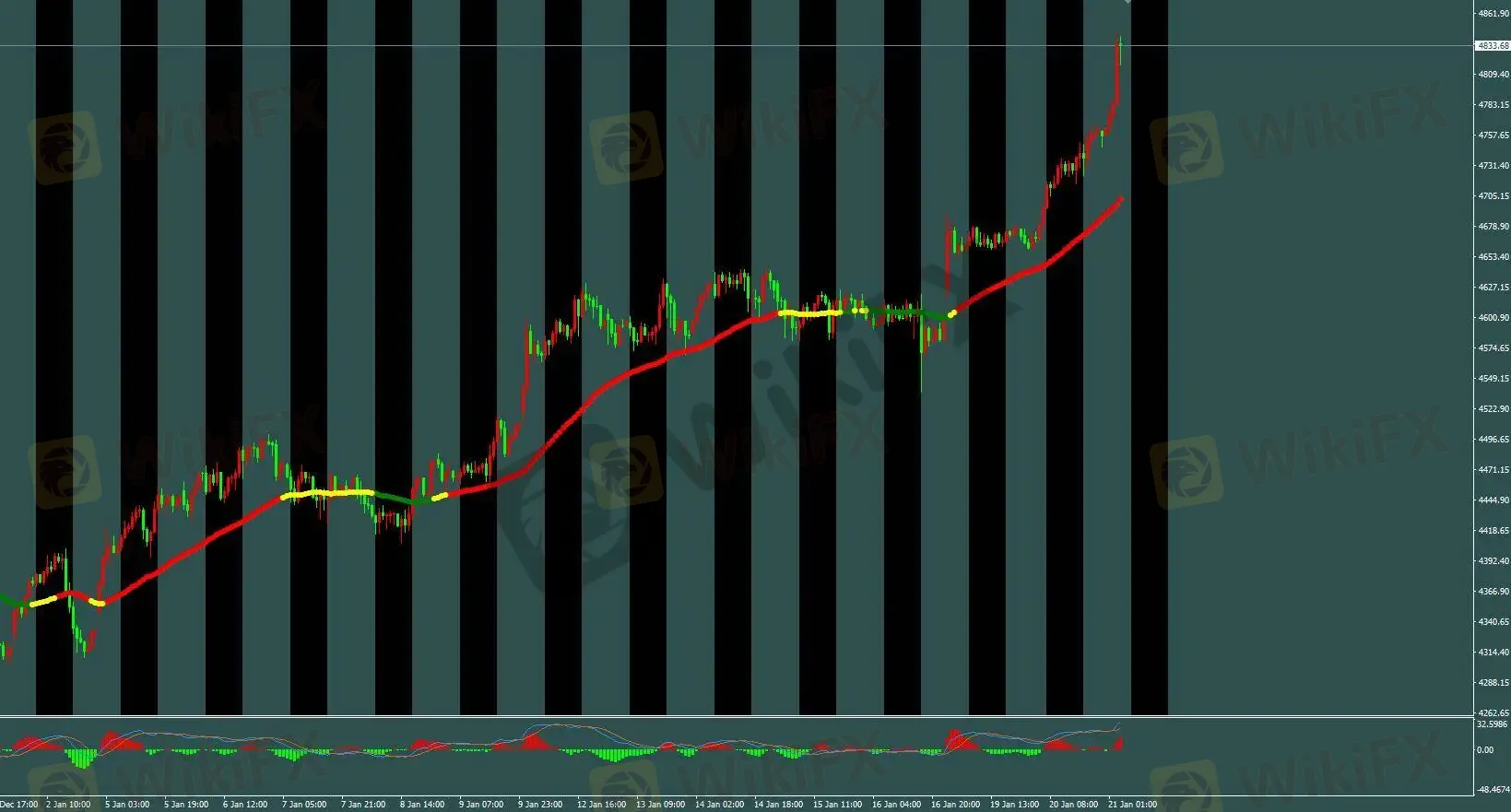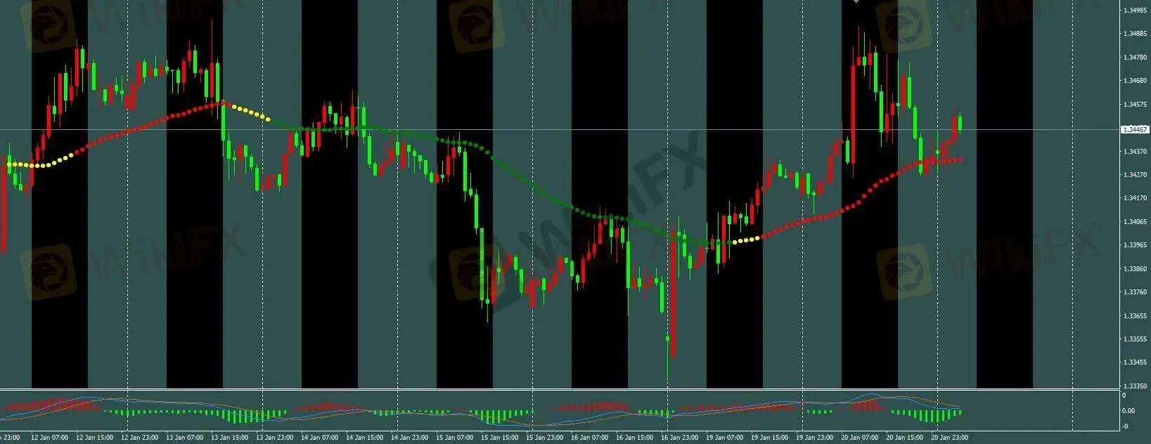 三色线颜色维持红色,可等待价格线接近三色线附近时,伺机布局 H1 标准多单,止盈 150 - 200 点,保护性止损设置于开仓位下方约 200 点处,或于三色线转绿时平仓。日内亦可结合 M5 基础运用模型进行短线操作。