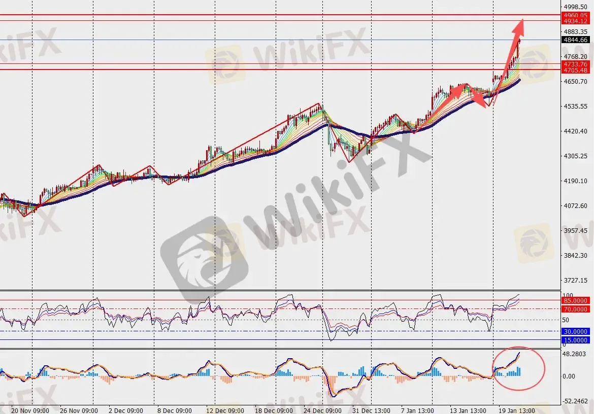 技术面:黄金H4级别持续上涨,并在48日多空分界线上方运行。此外,MACD双线和量能柱在零轴上方再次扩张。在美债规模不断上升以及政策不确定性加剧的情况下,投资者更倾向于投资黄金,而非货币和政府债券。