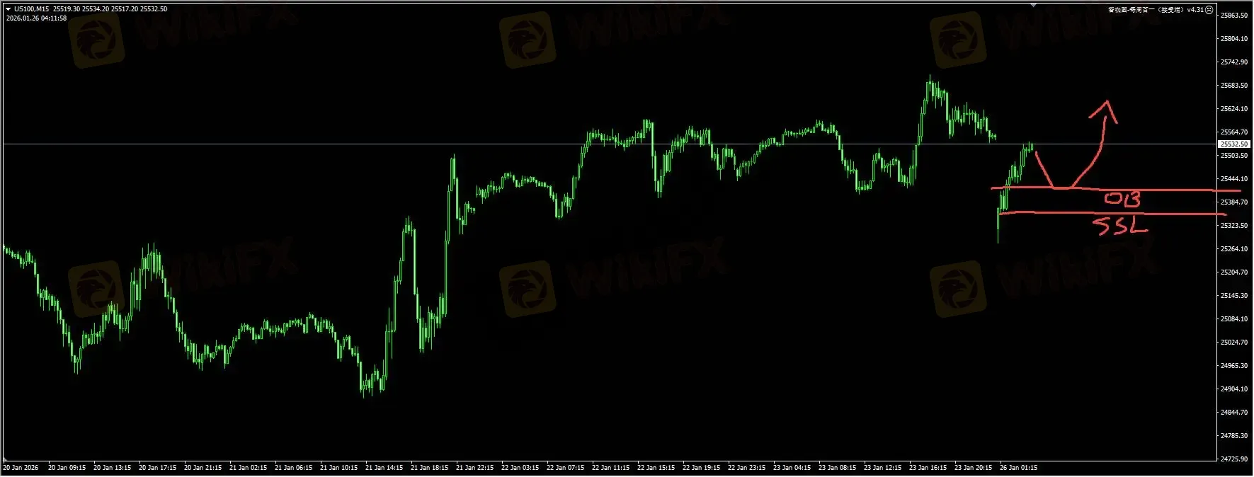 纳指:价格在25500附近展开扩张性的整理走势,加上本周中美股7巨头将会陆续公布财报。预计可能还会引起区间波动的走势。因此比较合理的操作是在当前区间的下端,寻找需求区或者扫流动性之后,捕捉多头反弹信号,然后拿着优势头寸等待财报公布。详细位置请咨询插件。