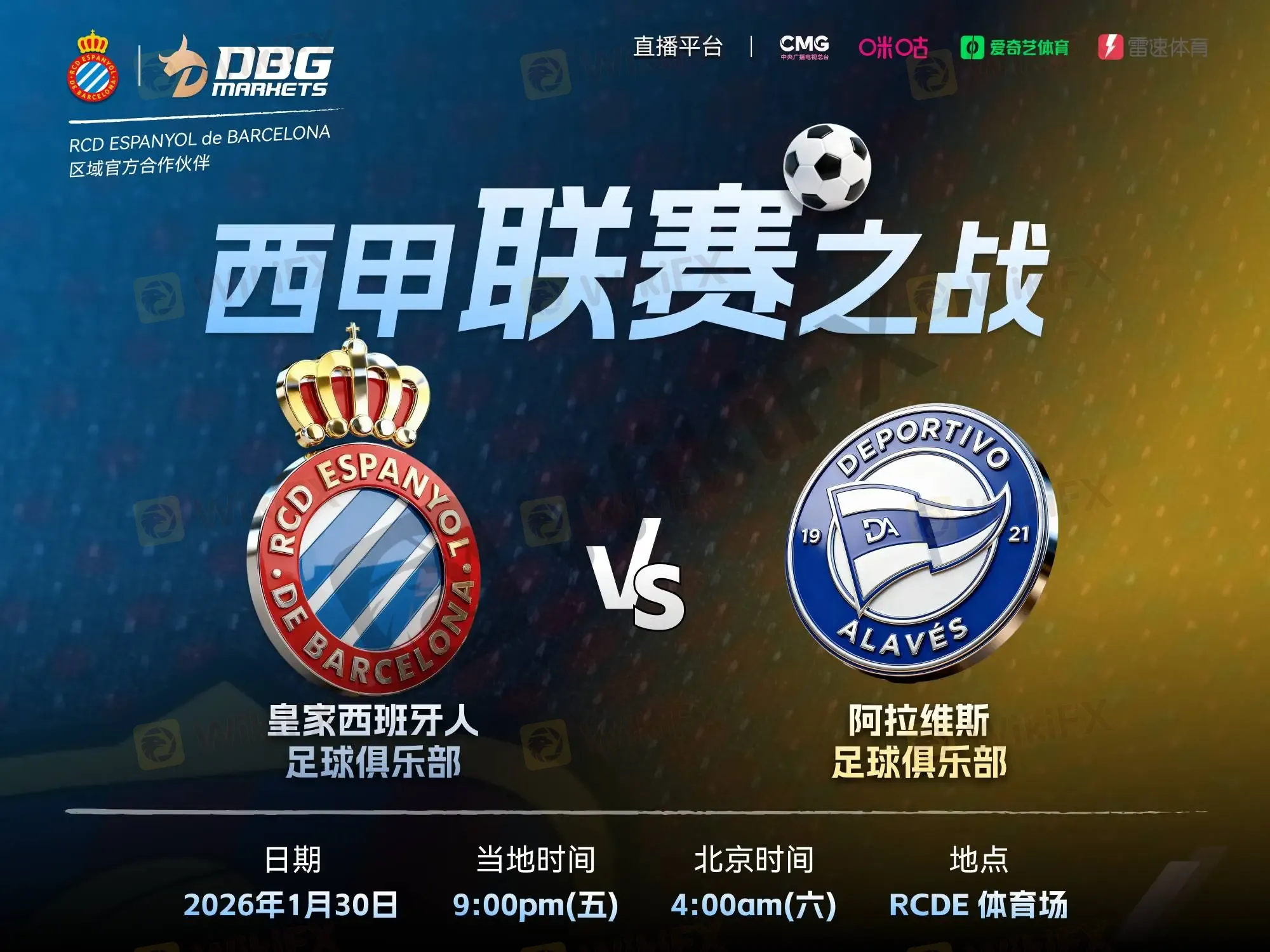 全球领先的多元资产交易平台 DBG Markets 将继续携手皇家西班牙人足球俱乐部(RCD Espanyol),迎来西甲赛场的第三个主场之战。1月30日,球队将在主场迎战阿拉维斯足球俱乐部(Deportivo Alavés)。