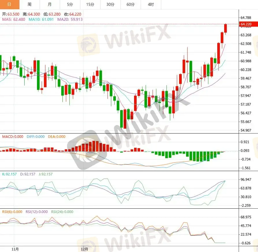从日线级别技术图形分析,WTI 原油价格整体仍维持在中期上升通道之内。价格已连续突破前期的震荡区间上沿,并稳固站在多条关键均线之上,短期与中期均线系统呈现多头排列格局,技术形态整体上对多方较为有利。动量指标如日线 RSI 也保持在强势区域,显示多头动能仍占主导。关键价位方面,每桶 63 美元附近已转化为短期重要支撑区域。若价格能持续守稳于此水平上方,则后市有望继续向上测试 65 美元等关键心理关口。反之,若地缘风险情绪降温或美元进一步走强,导致油价跌破 63 美元支撑,则可能向下回踩每桶 61.50 美元附近的技术支撑区域。