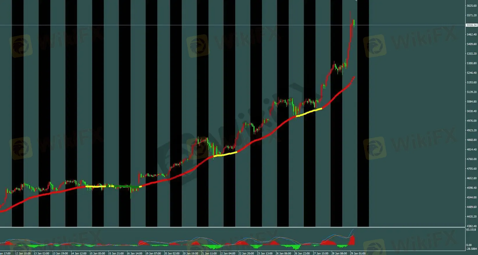 三色线已由黄转红,需等待价格线接近三色线附近再考虑 H1 标准多单入场,止盈约 70 点,保护性止损设于开仓位下方 120 点或趋势线转绿即平仓。日内可配合 M5 基础模型进行短线操作。