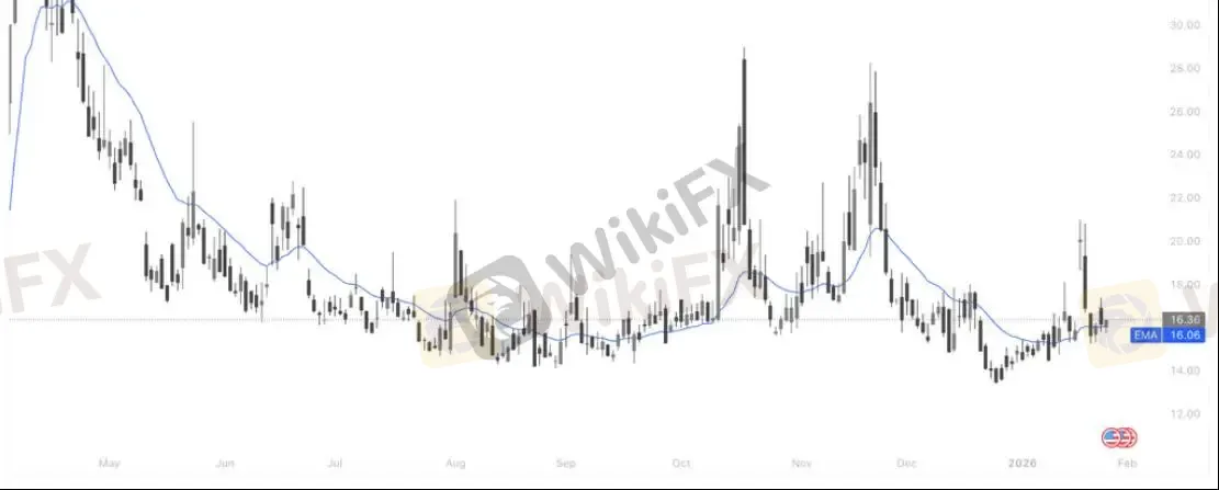 日线来看,波动率在前期冲高回落后进入长时间压缩整理区间,近期价格重新站上 EMA 并在其上方企稳,显示下行恐慌已明显缓和。当前结构呈现“低位抬升 + 均线托底”的特征,短线虽仍有反复,但只要不再跌破 16 附近的 EMA 支撑,整体更偏向于情绪修复而非新一轮恐慌启动,后续关注是否出现放量上行以确认波动率阶段性回升。
