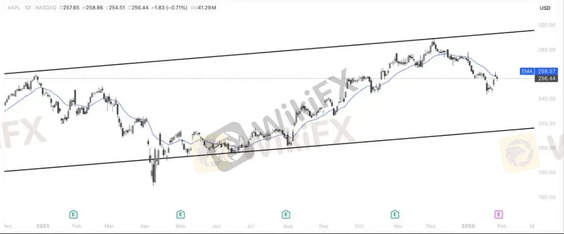 从日线结构看,股价在长期上升通道上沿附近受阻后回落,近期已跌破并反抽 EMA 均线,显示中短期趋势开始由强转弱。前期高点未能延续创新高,形成明显的高位钝化 + 回落确认结构,反映资金在财报前主动降仓、风险偏好下降。关键位置上,258–260 美元一线为当前均线压制区,若无法快速收复,该区间将转化为反弹阻力;下方需重点关注 250 美元附近的前期密集成交与结构支撑,一旦失守,回撤目标可能指向通道中轨甚至更低位置。