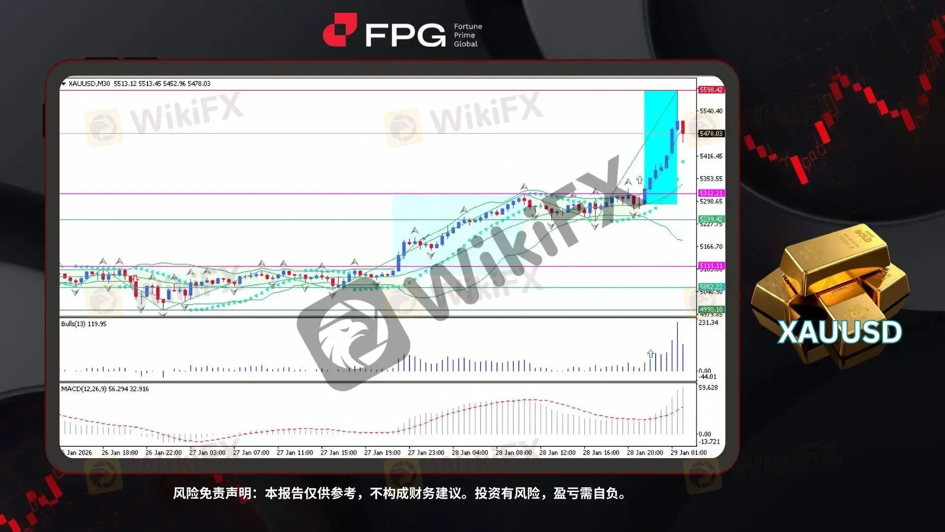 摘要:在 M30 时间周期上,XAUUSD(黄金)飙升至全新历史高点 5598,相较昨日的历史高点出现了极为激进的多头扩张,单个交易日涨幅超过 5%。在前一交易时段的大部分时间里,黄金维持横盘整理,但在亚洲时段价格突然大幅上冲,并迅速加速上涨至 5598 高点。分析时段内,价格交投于 5478 附近,而波动性仍然处于极高水平,反映出市场环境极不稳定,且散户与机构交易者均在积极参与。从技术面来看,黄金依然