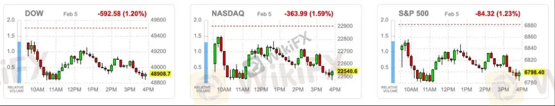 摘要:大盘回顾风险情绪升温,大宗与科技共振走弱全球市场风险偏好明显降温。芝商所上调金银期货保证金,引发贵金属加速去杠杆,现货白银年内涨幅被完全抹平,黄金同步承压;叠加美国职位空缺降至2020年以来低位,强化经济放缓预期,美股三大指数集体收跌,纳指连续三日回落。科技权重成为主要拖累,Amazon 盘后重挫超11%,公司预计全年资本开支约2000亿美元远超预期,引发市场对AI投入回报周期与现金流压力的担忧。
