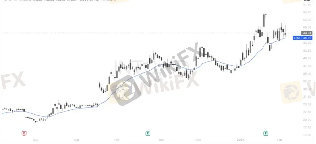技术面来看,股价维持在上升均线结构之上,高低点持续抬升,在大盘与科技板块集中回调阶段表现出明显相对强势,显示资金承接稳定。当前处于高位整理区间,若后续风险偏好回升并带动科技板块修复,英特尔有望向上突破并进入新一轮趋势扩展阶段;反之若失守均线支撑,则将回到震荡修复结构。整体而言,属于弱市中的结构性强者。