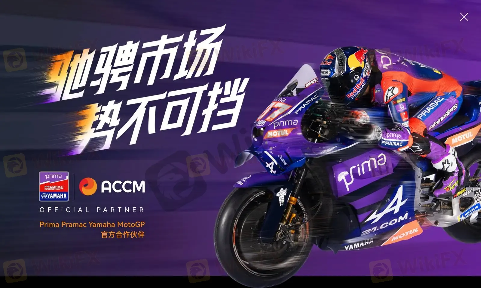 全球领先的老牌差价合约经纪商ACCM宣布,与Prima Pramac Yamaha MotoGP车队正式展开合作。这次合作,ACCM 将正式参与到 MotoGP 这一世界级摩托车赛事平台中,也开启了金融科技与顶级赛车运动的全新跨界联动。