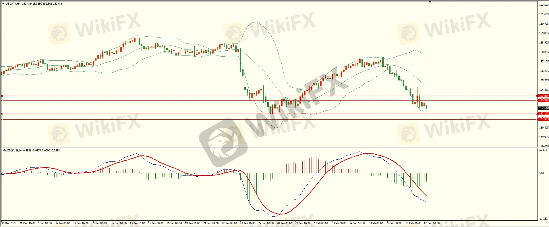 美日昨日反弹至第一阻力承压下行,至收盘回落至第二支撑略有反复,日线再度报收阴线,短线空头继续占优,从4H来看,布林中轨偏下,MACD零轴下方运行,日内上方首要阻力153.35,第二阻力153.80,下方支撑152.10,151.55,保持在第一阻力下方短线有望测试第一支撑。