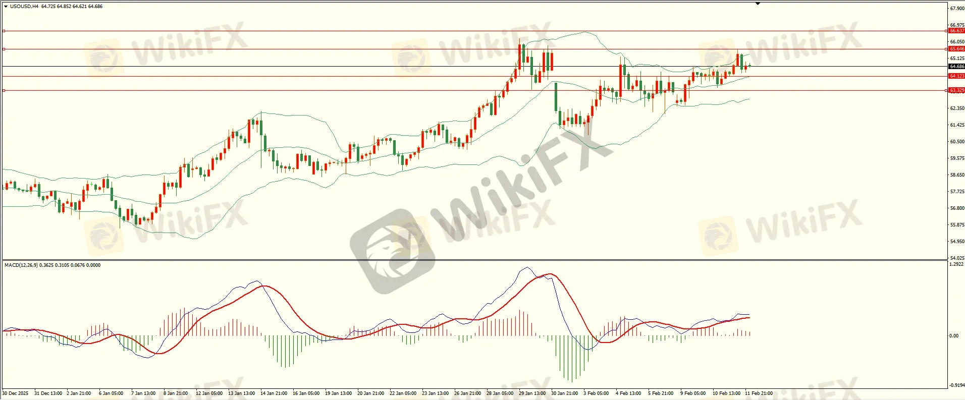 原油昨日小幅回调后震荡上行,盘中触及第一阻力遇阻回落,日线报收上影线中阳线,上方阻力保持,收复后方可继续,从4H来看,布林中轨偏上,MACD零轴上方运行,日内下方首要支撑64.10,第二支撑63.30,上方阻力65.60,66.60,保持在第一支撑上方短线有望测试第一阻力。