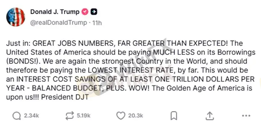 不过数据公布后,特朗普随即于Truth Social发文提醒降息的重要性,非农数据表现良好,美国利率应大幅降低,可为美国政府减轻1兆美元的政府利息支出,美国应支付最低利息,并且远低于期他国家。