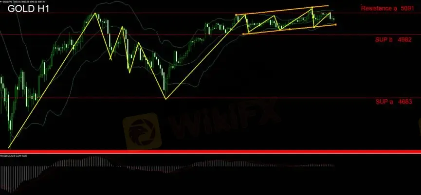 黄金短线进行横向震荡,布林带开口指引,未有明确方向性,于昨日美盘时段出现假突破,一度上破5091,但多头材火未见续航动能,走势再度回落至5091下方,因此操作面仍应以空方进行观察。