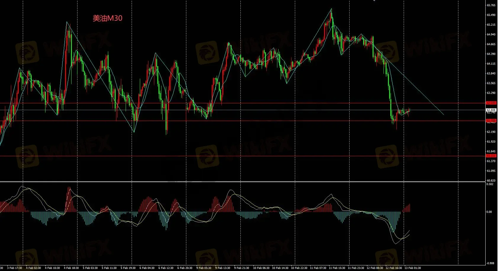 美油M30日内震荡走势后下冲走势,短线多头结束,该空头下跌或持续数日。逢高卖出操作;下方重要支撑位62.5;61.5和60。