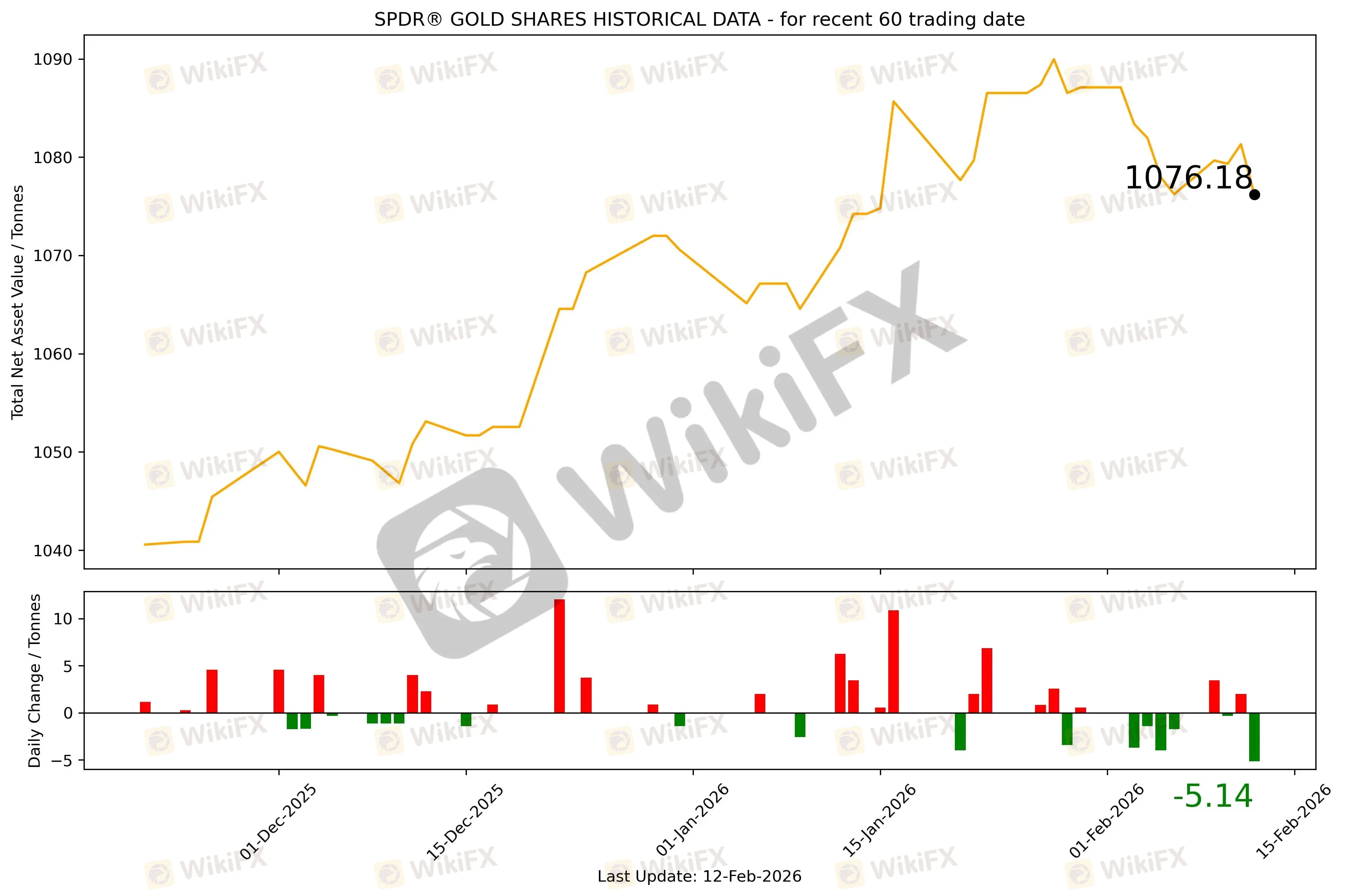 截至2026年2月13日,全球最大的黄金ETF SPDR Gold Trust持仓量为1076.18吨,较上一个交易日减少5.14吨。2026年2月13日现货黄金自5086.07美元/盎司开盘后瞬间冲高至5100.21美元/盎司,随后迅速回落。亚盘和欧盘交易时间在5050-5080美元区间震荡,美盘交易时间半小时内暴跌近200美元,最低向下触及4878.686美元/盎司,最终收于4921.109美元/盎司,跌163.641美元或3.22%。