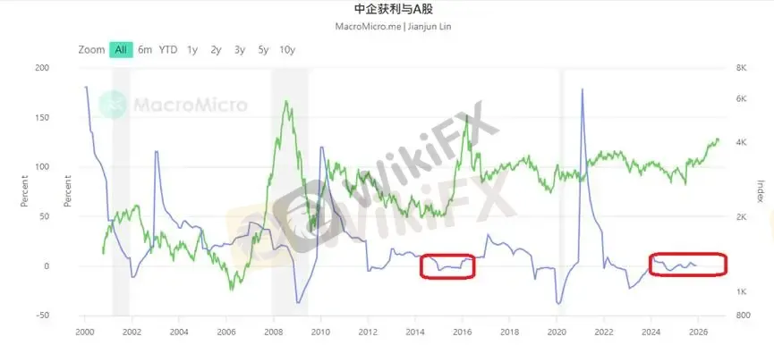 从下图表一,对照中企盈利表现与A股走势图,2015年同样受惠资金效应推动A股大涨,但企业盈利未跟上。如今,2026年似乎也呈现同样局面,投资人必须关注此波A股行情为不可持续性。