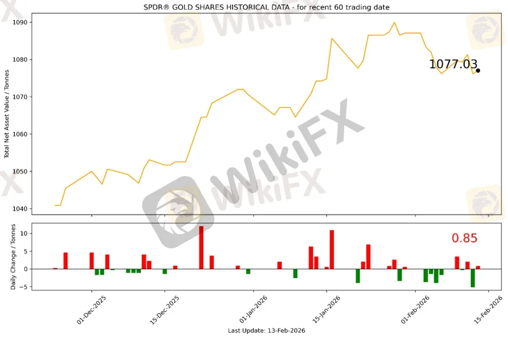 截至2026年2月13日,全球最大的黄金ETF SPDR Gold Trust持仓量为1077.03吨,较上一个交易日增加0.85吨。2026年2月16日现货黄金跳空低开于5036.19美元/盎司,随后迅速下探5010美元一线获得支撑;盘中一度下行至4956.33美元/盎司,后拉升至5000美元一线宽幅震荡。最终收 于4993.41美元/盎司,跌42.75美元或0.85%。