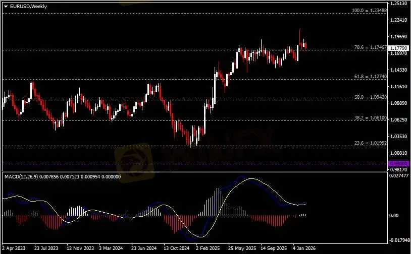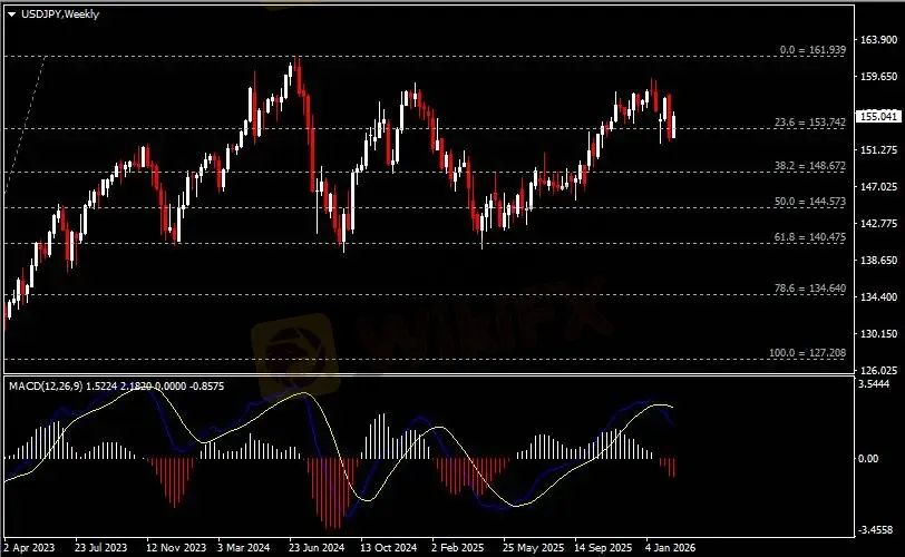 周线图显示美元兑日元反弹回涨,当前收于153.70支撑。从MACD来看,快慢线向下运行,红色动能柱温和放量。汇价走势和动能柱的变化呈分歧。