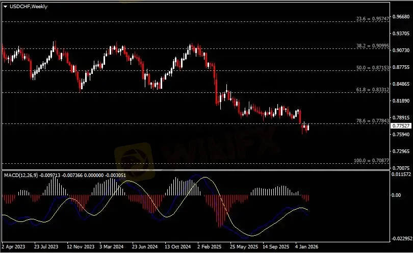 周线图显示美元兑瑞郎低位反弹,当前测试0.7780阻力。 从MACD来看,快慢线向下运行,红色动能柱则温和收缩。汇价走势基本和动能柱的变化一致。