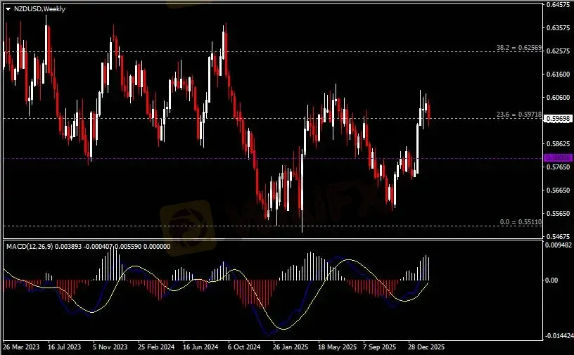 周线图显示纽元兑美元回调下跌,当前测试0.5970支撑。从MACD来看,快慢线向上运行,白色动能柱则温和收缩。汇价走势基本和动能柱的变化一致。