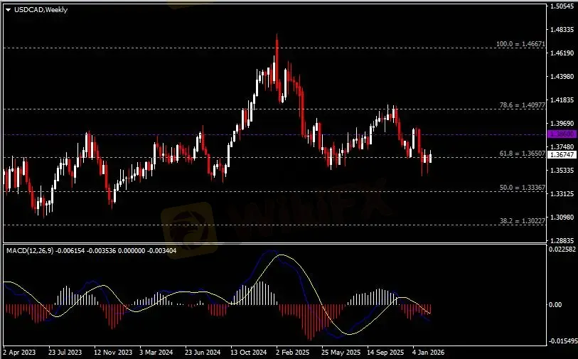 周线图显示美元兑加元反弹收涨于1.3650支撑。从MACD来看,快慢线向下运行,红色动能柱则温和收缩。汇价走势基本和动能柱的变化一致。