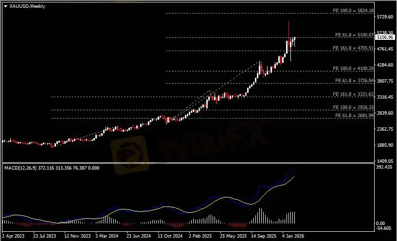 周线图显示金价震荡上行,当前持续测试5100关键阻力。从MACD来看,快慢线向上扩张,白色动能柱温和放量。金价走势基本和动能柱的变化一致。