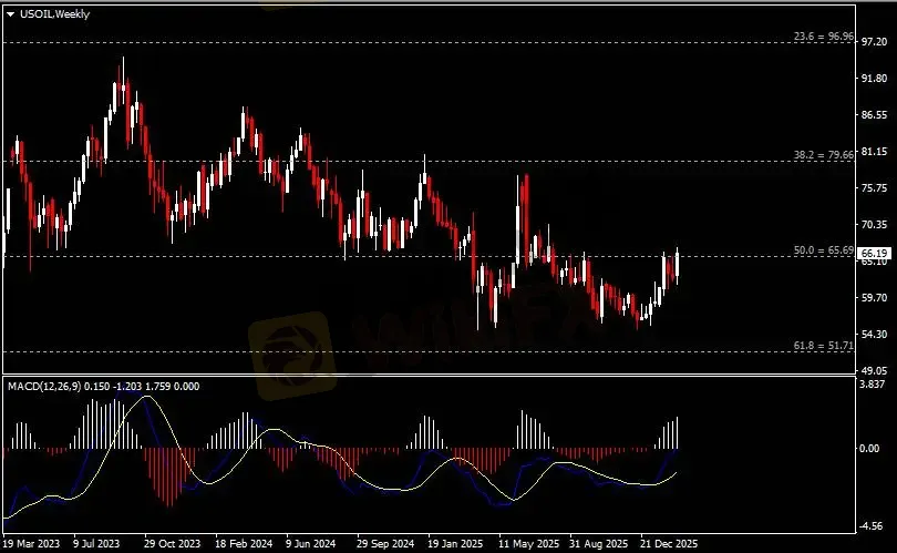 周线图显示油价震荡上涨,当前测试65.70阻力。从MACD来看,快慢线向上扩张,白色动能柱持续放量。油价走势基本和动能柱的变化一致。