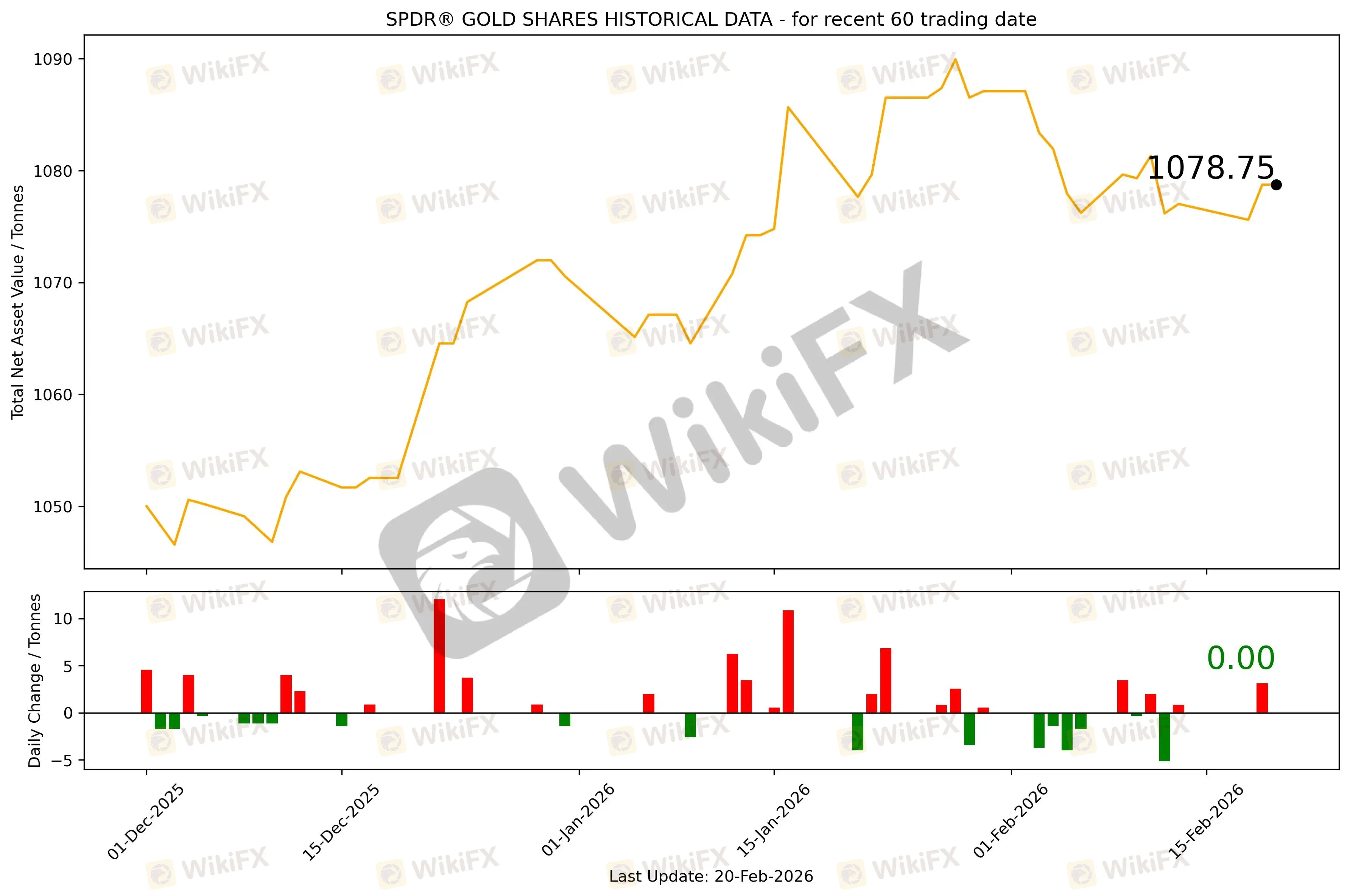 截至2026年2月20日,全球最大的黄金ETF SPDR Gold Trust持仓量为1078.75吨,与上一个交易日保持不变。2026年2月20日现货黄金自5001.18美元/盎司开盘后震荡上行,盘中最低向下触及4981.87美元/盎司;美盘盘前受特朗普关税案裁决结果影响大跌60美元又迅速拉回,最终收于全天高点5108.36美元/盎司,涨107.18美元或2.14%。