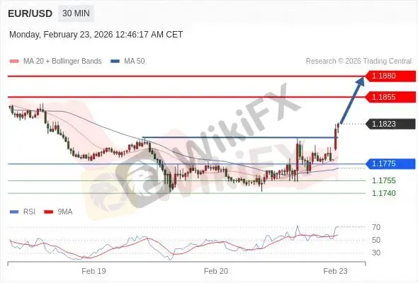交易策略: 在 1.1775 之上,看涨,目标价位为 1.1855 ,然后为 1.1880。